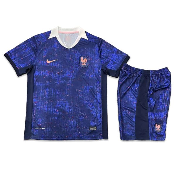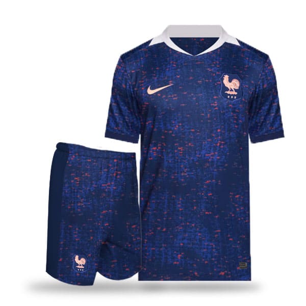 رنگ آبی دریایی عمیق پسزمینه اصلی این لباس را تشکیل میدهد، همان رنگی که یادآور پیروزیهای تاریخی در جام جهانی و ملتهای اروپاست. نوارهای عمودی یا افقی سفید و قرمز که از پرچم فرانسه الهام گرفته شدهاند، با ظرافتی خاص بر روی پیراهن یا کنارههای شورت خودنمایی میکنند.